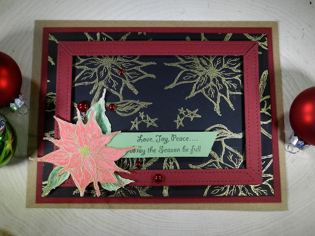 Today I am using the Classic Christmas Art Rubber Stamp Set by Pam Bray Designs from Sin City Stamps. I love how the large poinsettia stamp can be used as a background or a focal point. I have incorporated both options in my card for today.