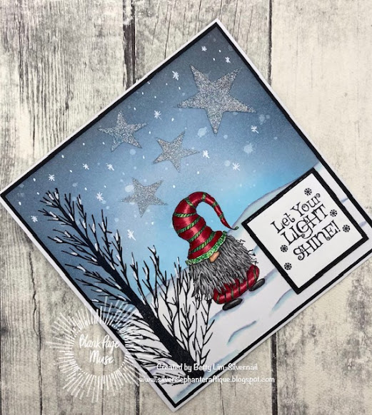 Greetings BPM Fans! Did you know that gnomes are a symbol of good luck? Farmers still use them today to watch over livestock and crops. They place gnomes in the rafters of the barn or put them in their gardens. I just think they are so cute. Just check out this adorable one from Blank Page Muse called StarBright Gnome Wintery Tree Let Your Light Shine by Pam Bray. This stamp set comes with a 5" tree and the sentiment, Let Your Light Shine. I colored him in red and green colors for a winter card, but you can color him any color and add leaves on the trees for any occasion card or project.